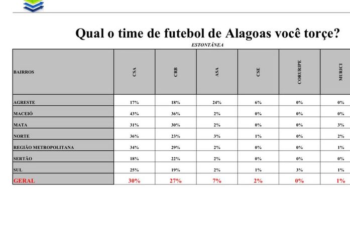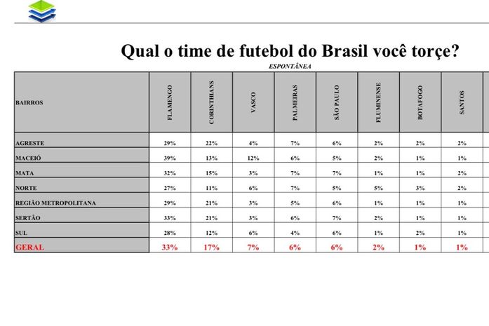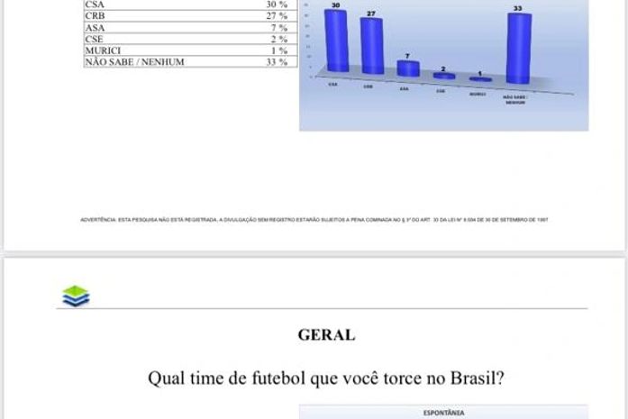 A pesquisa ainda questionou os alagoanos “Qual time de futebol você torce no Brasil?”. Com larga vantagem, o Flamengo com 33%, seguido por Corinthians com 17%, Vasco 7%, Palmeiras 6%, São Paulo 6%, Fluminense 2%, Botafogo, Santos e Grêmio, os três com 1% e 2% optaram por não sabem ou nenhum time.